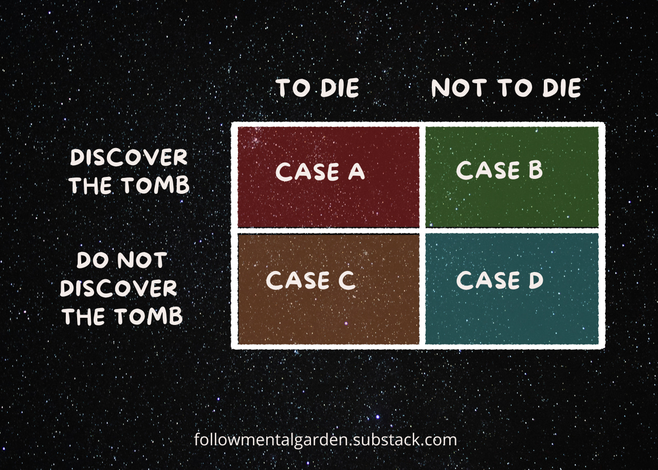 Case B: Discovery of the tomb, but long and normal life. This is a neutral event and is underestimated in our memory because nothing unusual happened. It’s hard to remember something in which nothing happened, and we tend to ignore this case.